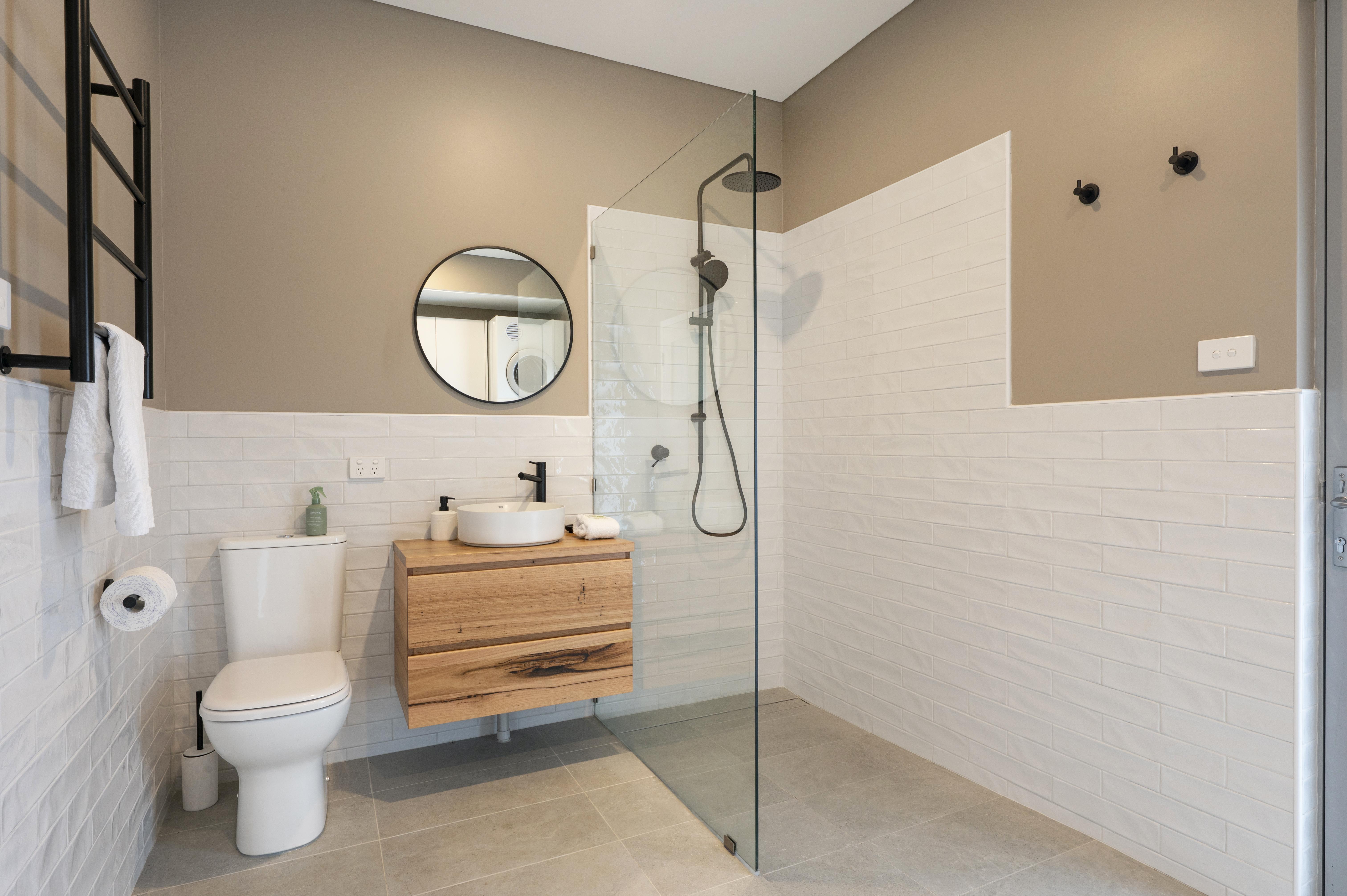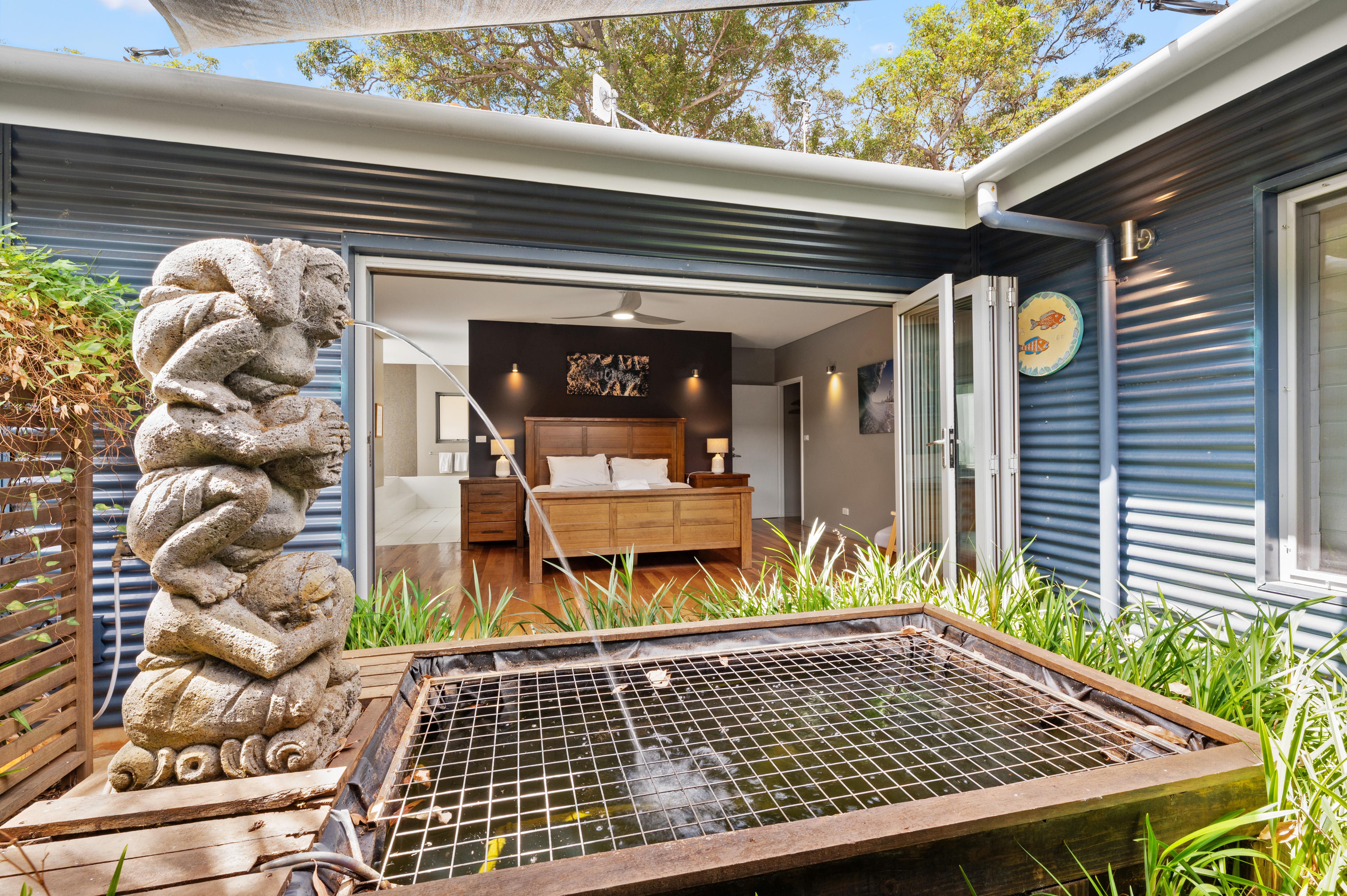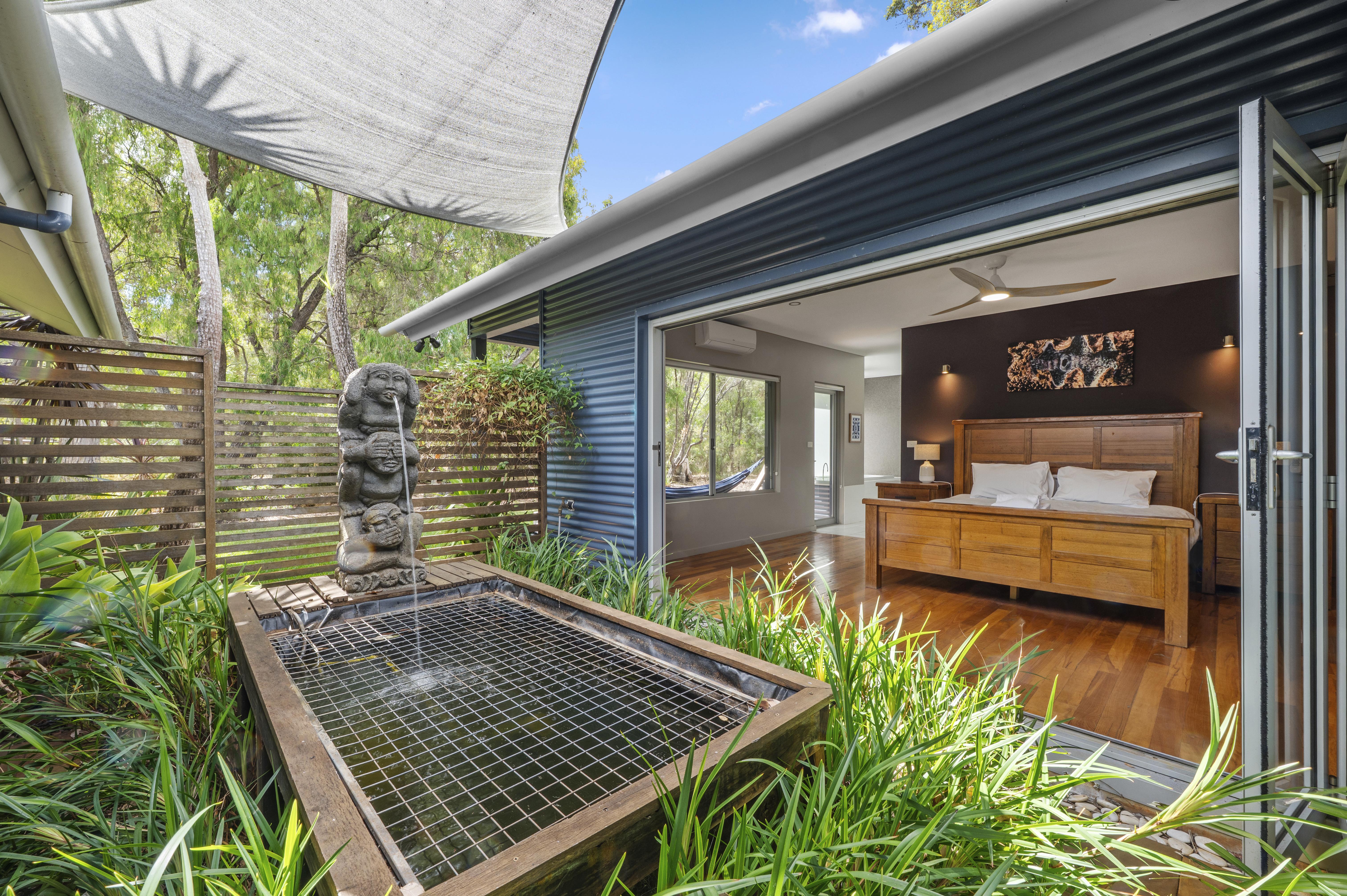 The master suite features its own private garden with tranquil Bali water feature, & its own luxurious five star en suite boasting superb bush views.