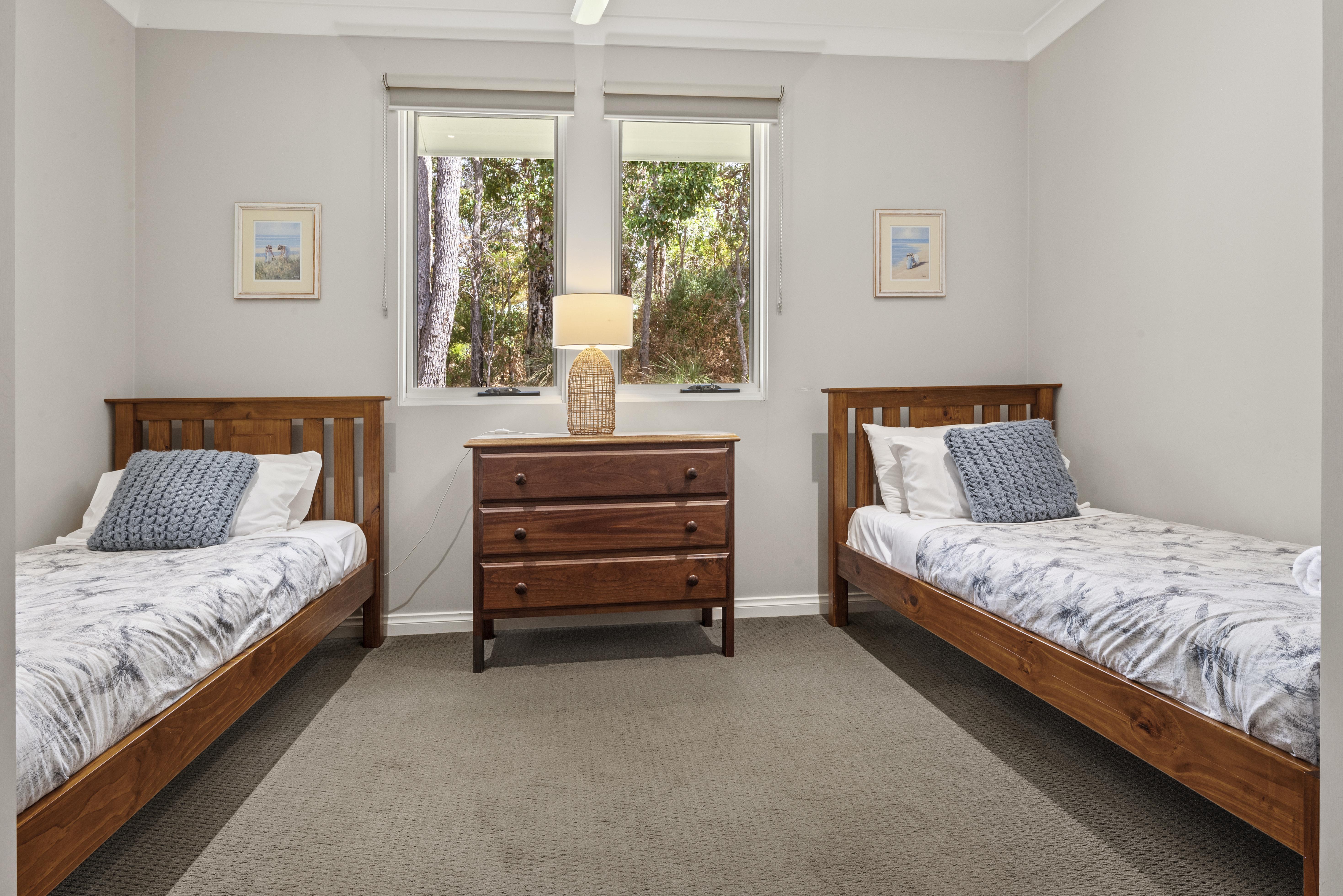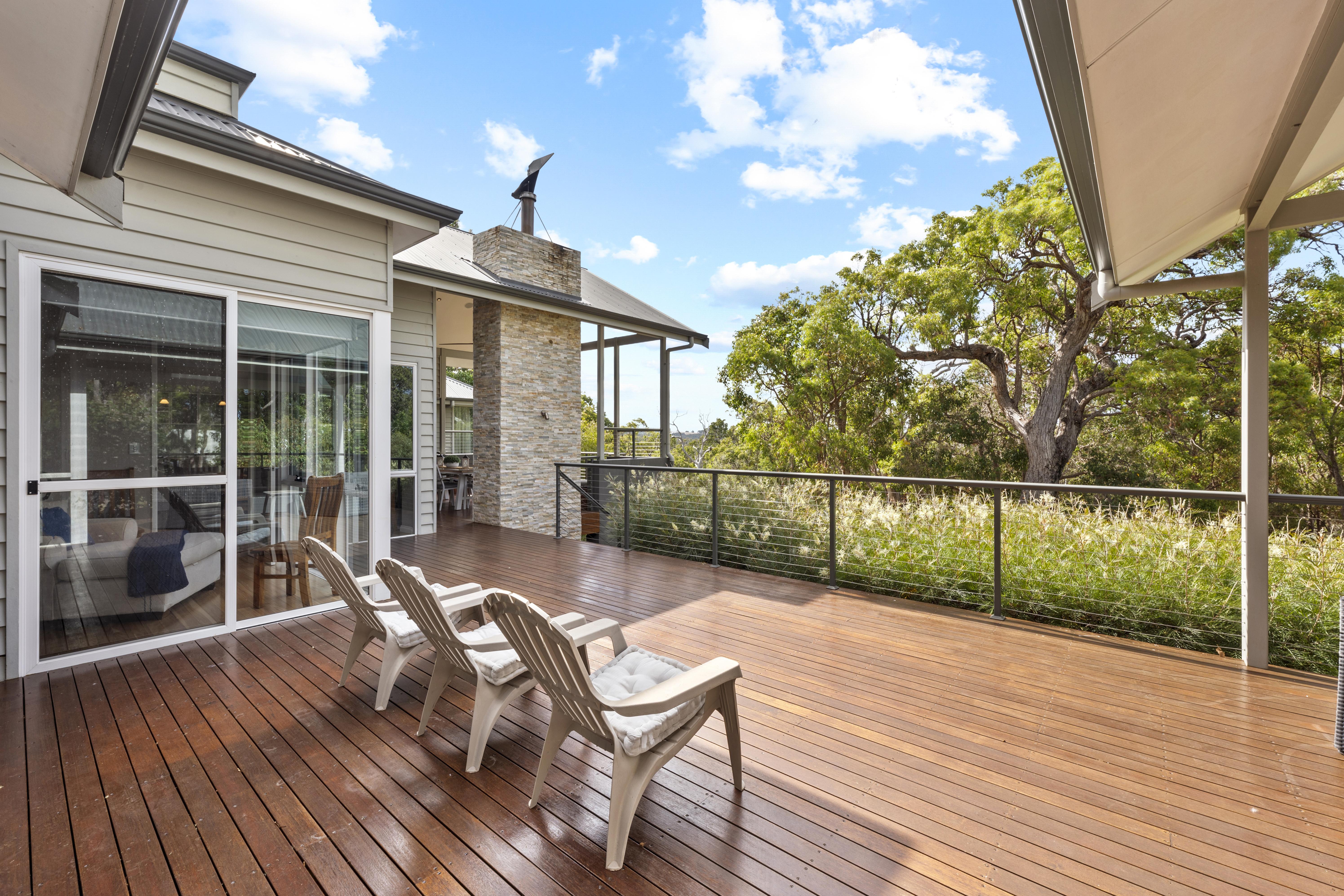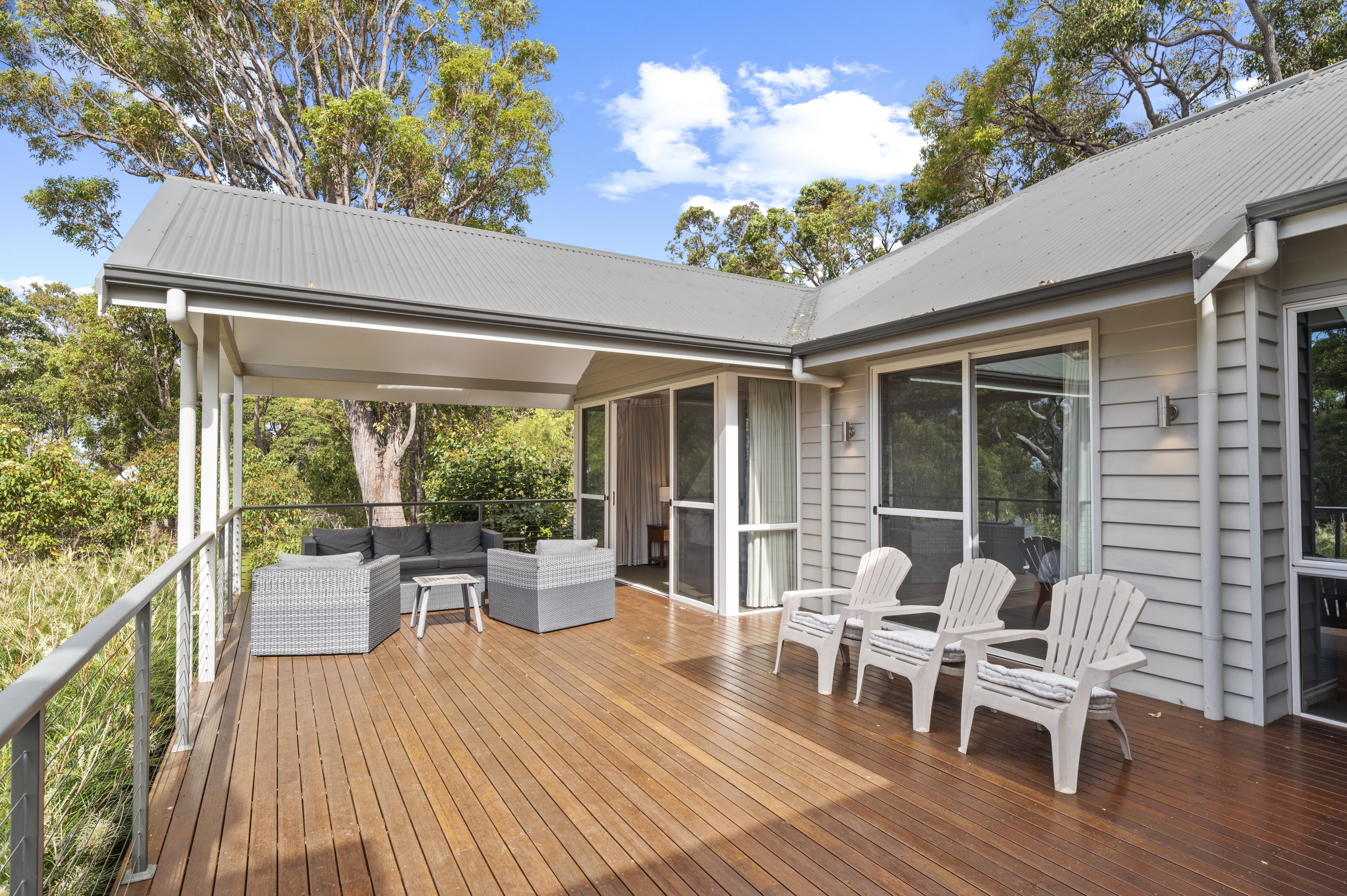 Bedroom three has reverse cycle air-conditioning, a queen bed, balcony entrance and views of the surrounding bush land. Bedrooms four and five each have two single beds, ceiling fans , oil heaters, these three bedrooms share the main bathroom which has vanity, shower, separate bath and powder room.