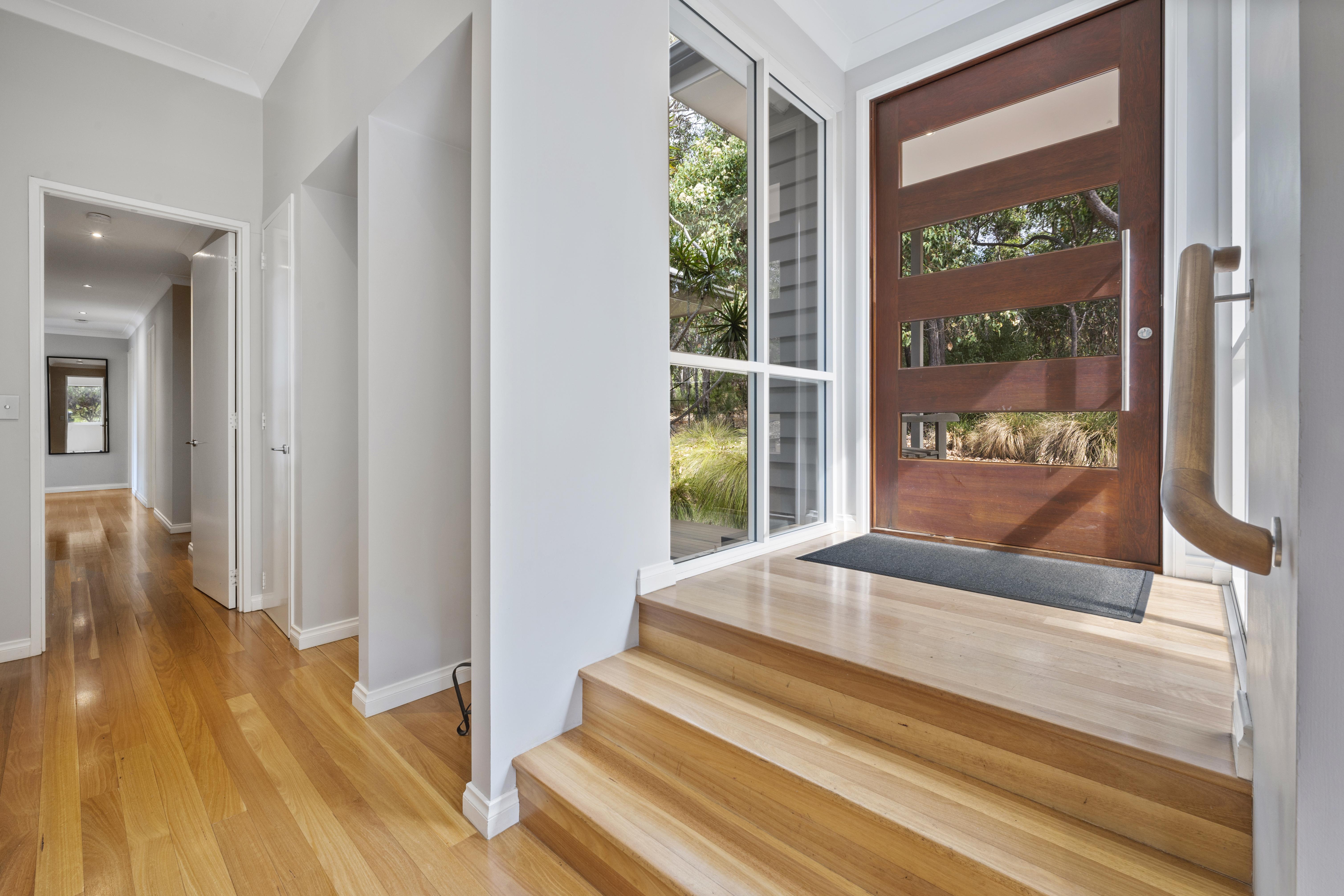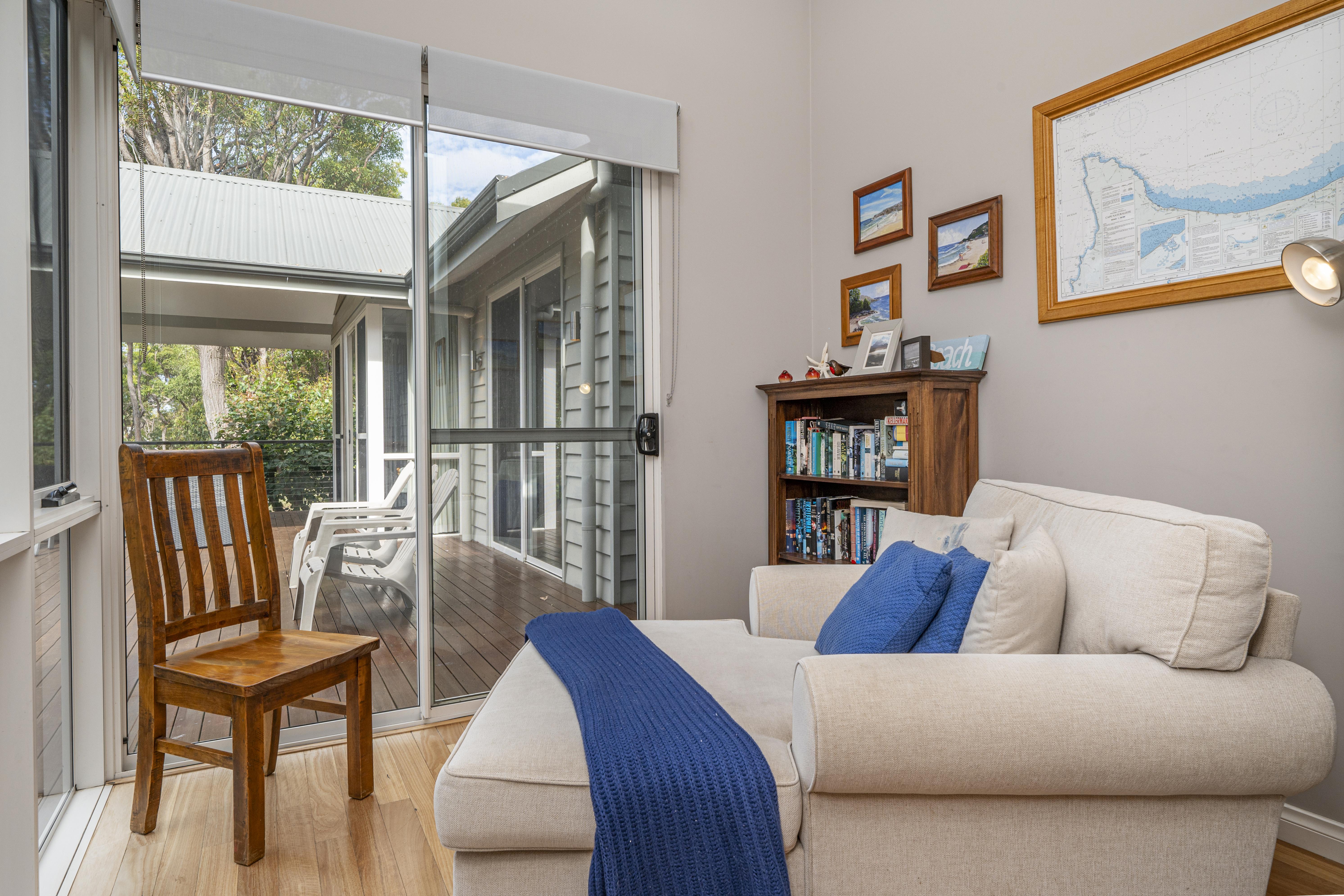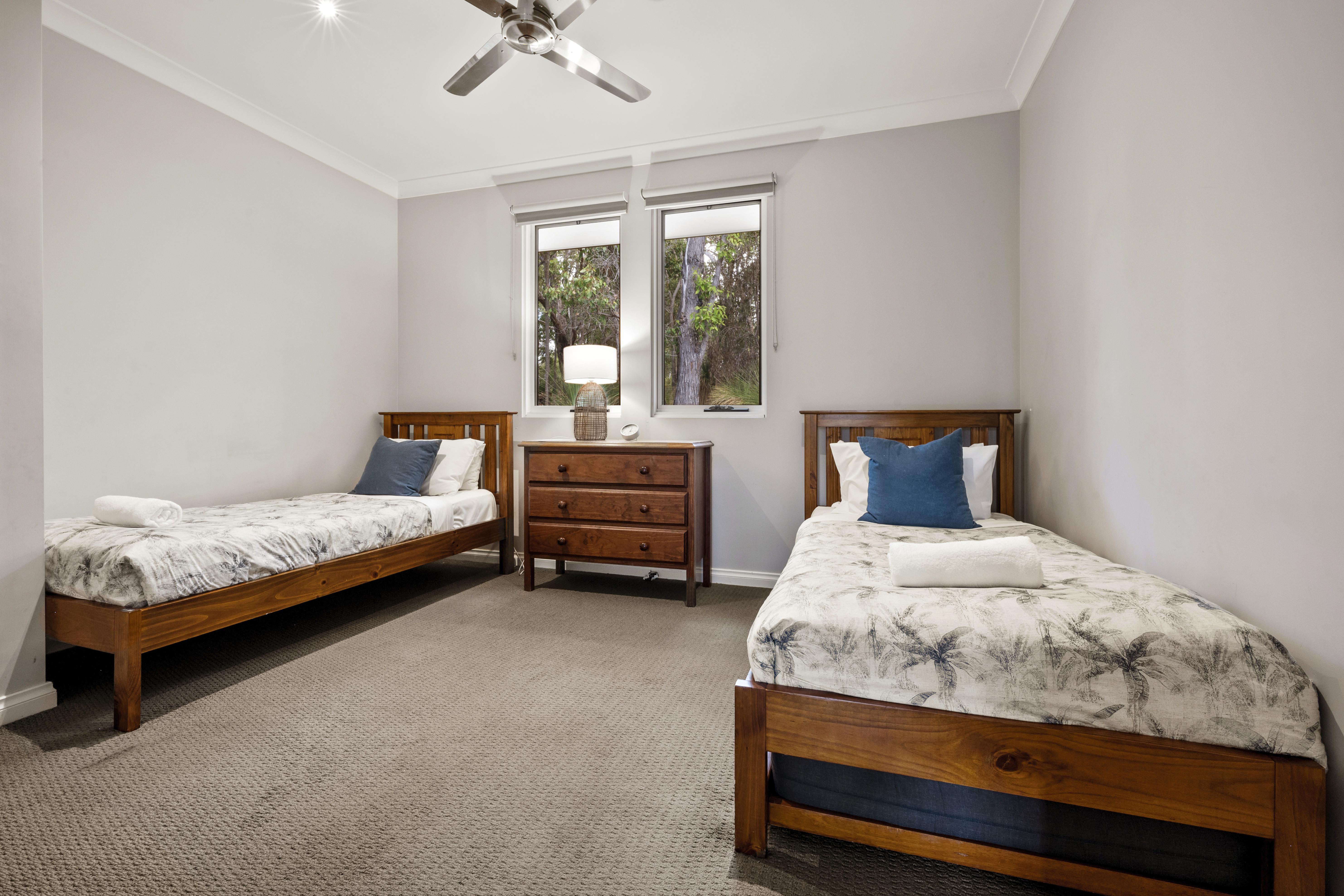 Bedroom three has reverse cycle air-conditioning, a queen bed, balcony entrance and views of the surrounding bush land. Bedrooms four and five each have two single beds, ceiling fans , oil heaters, these three bedrooms share the main bathroom which has vanity, shower, separate bath and powder room.