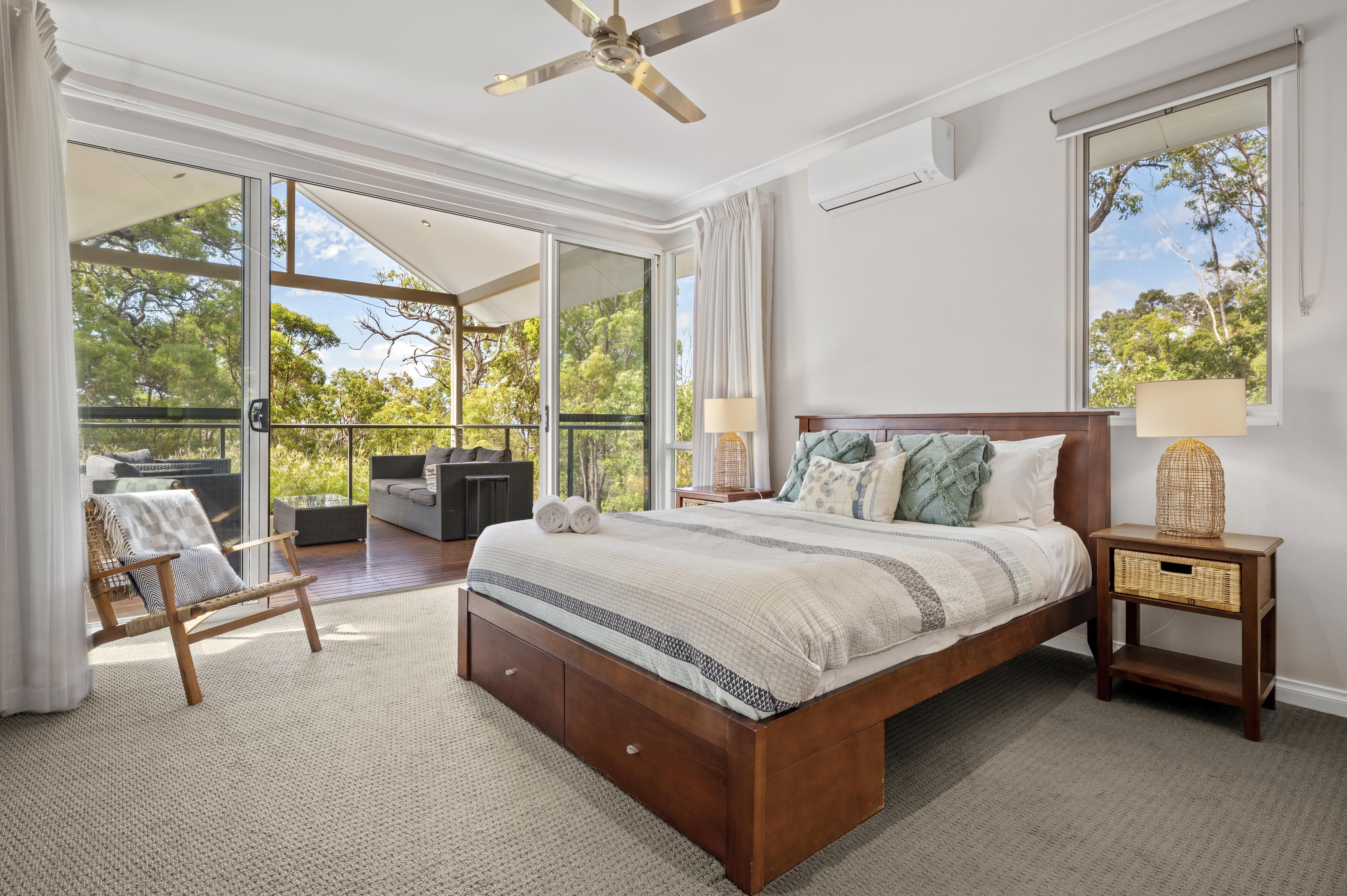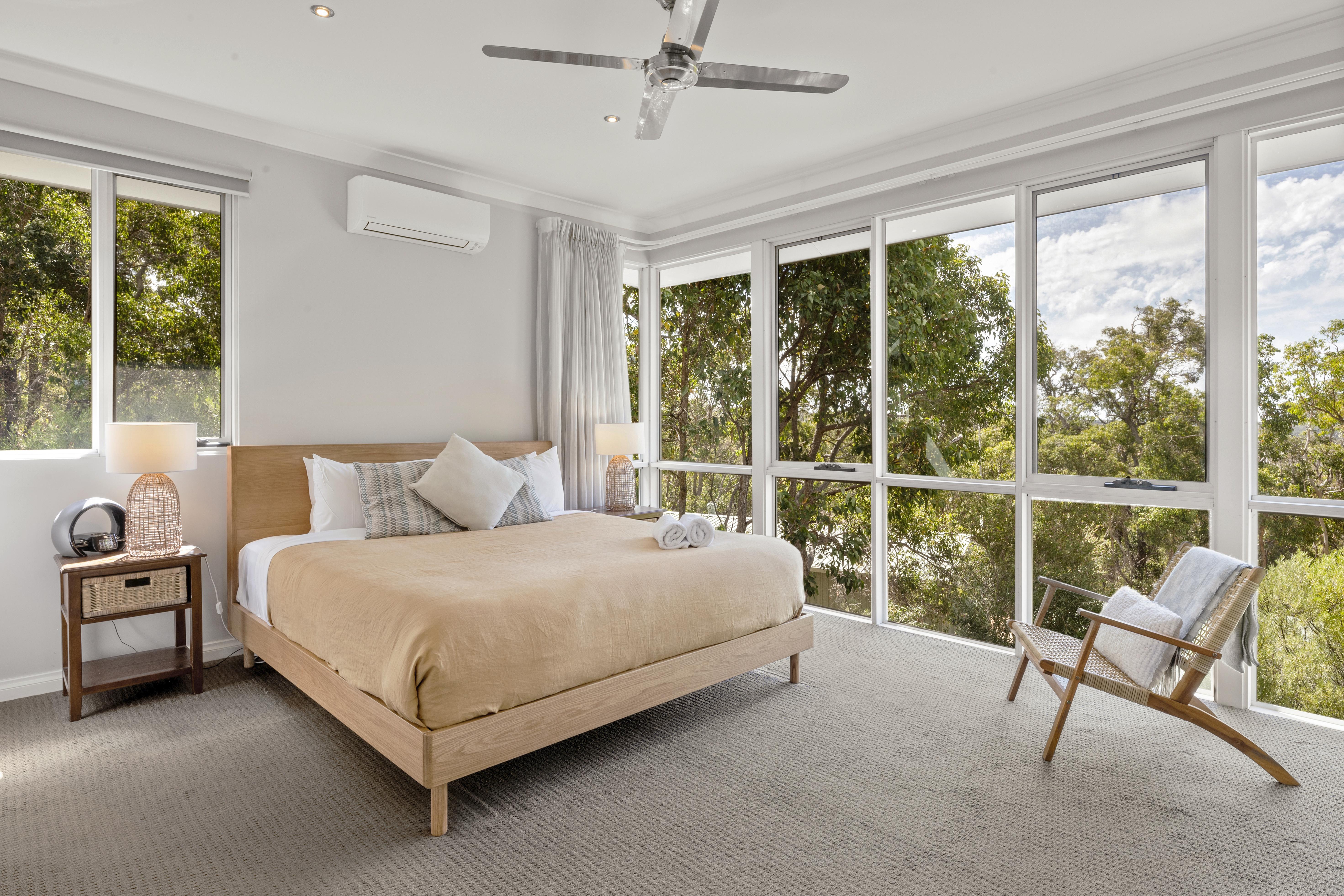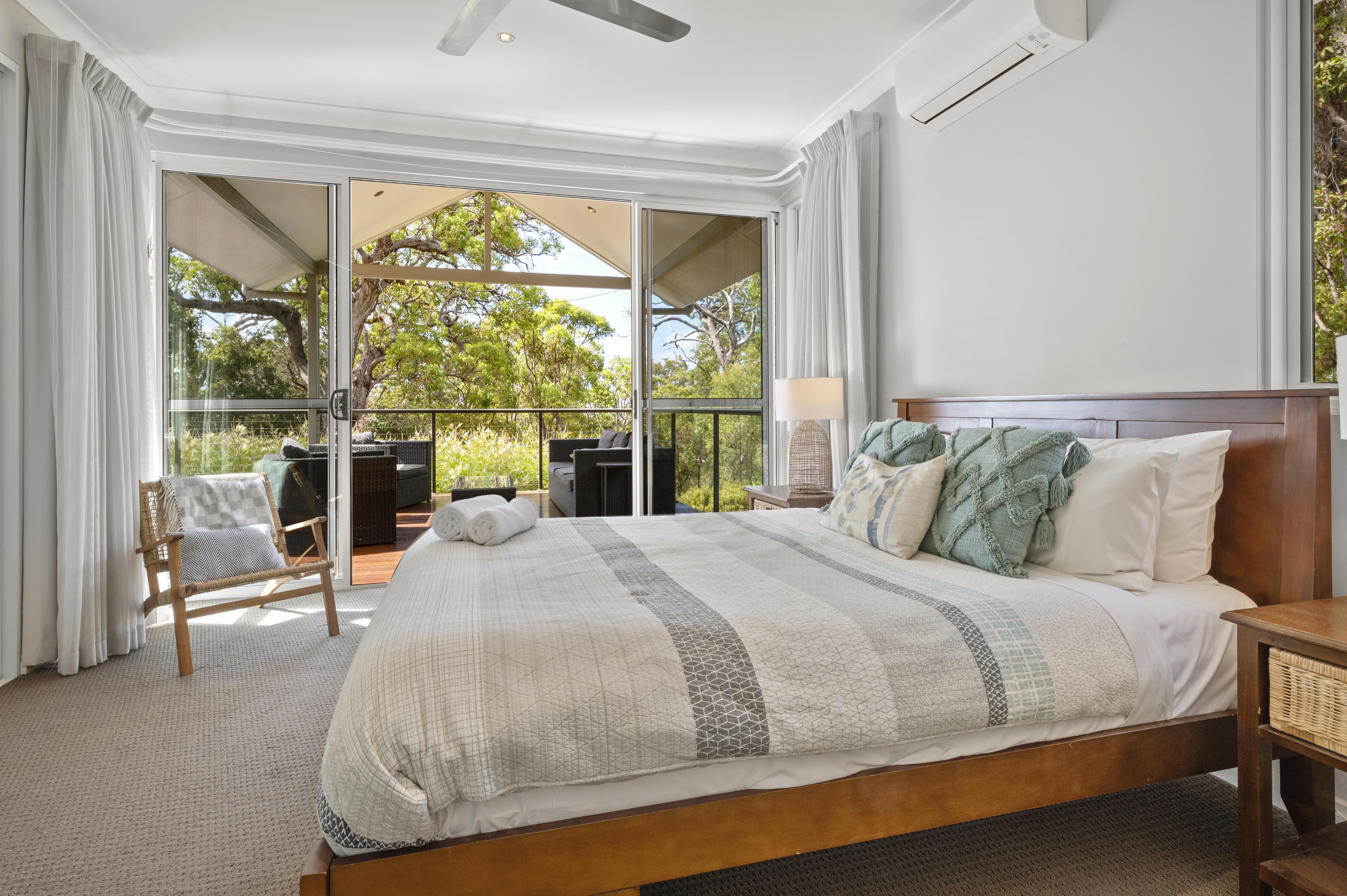 Sleeping ten people in five bedrooms, the main bedroom with King Bed, spacious en-suite with his and hers basins, shower and separate bath, reverse cycle air-conditioning, flat screen Television and views out to the surrounding bush land.