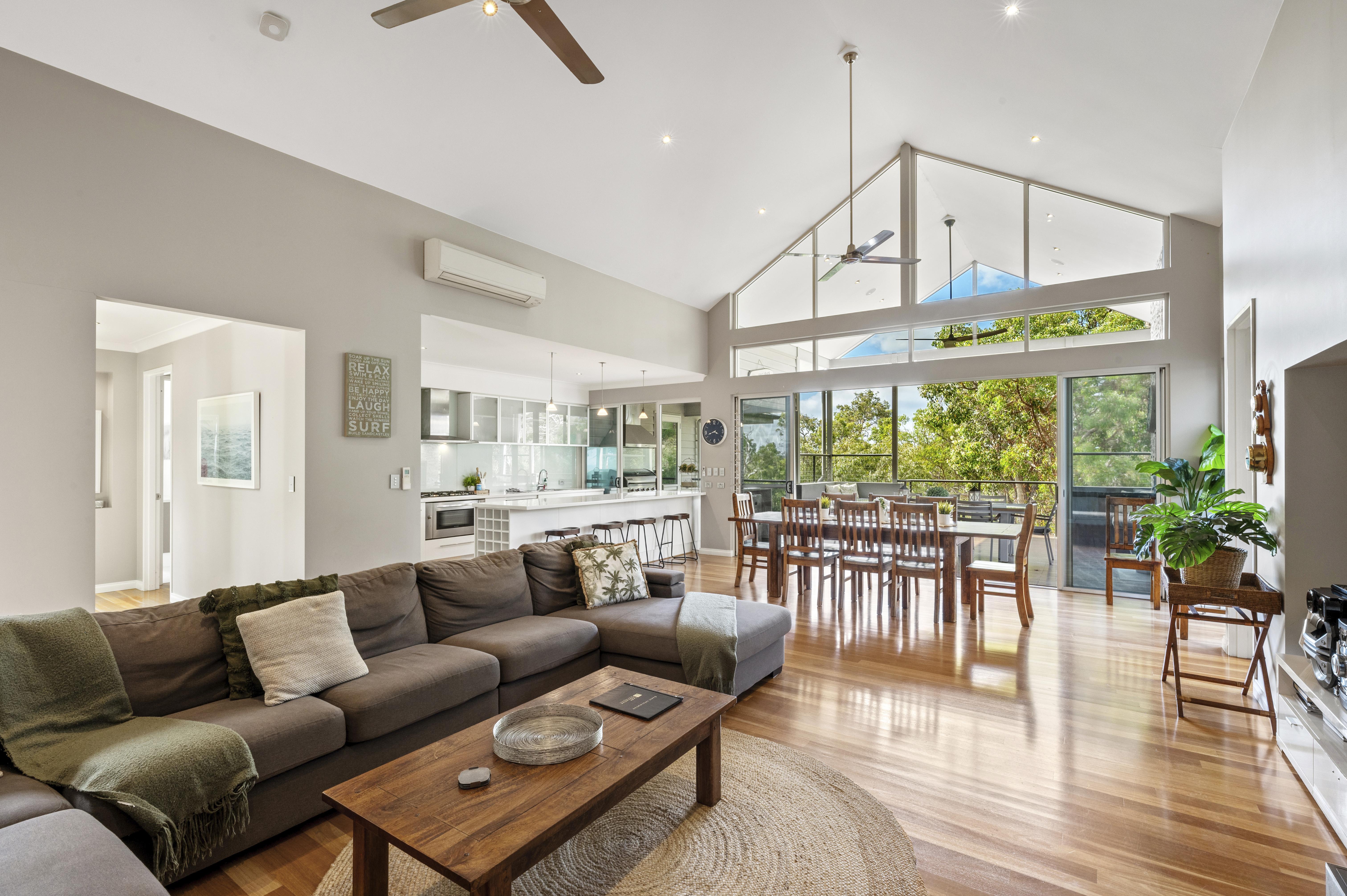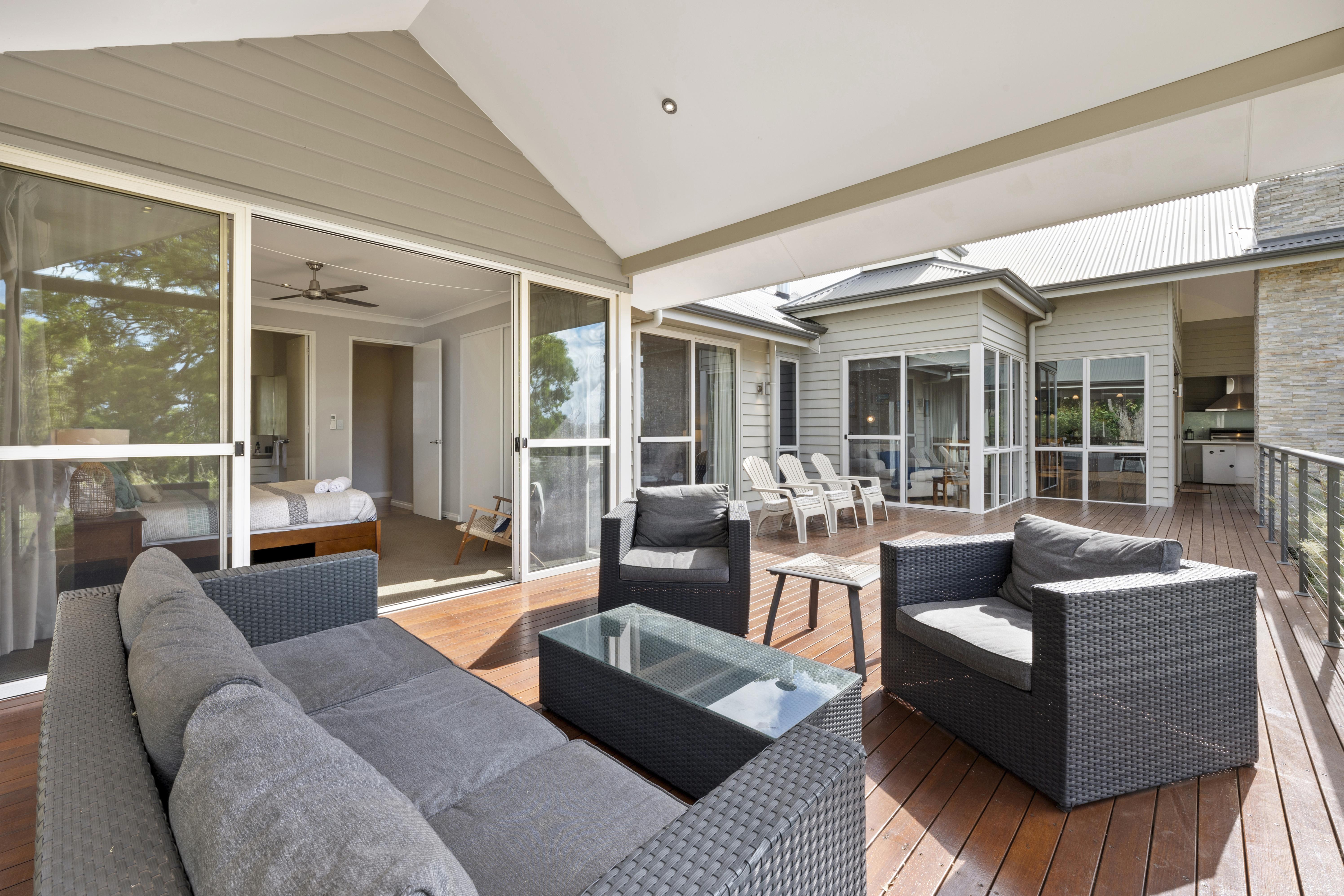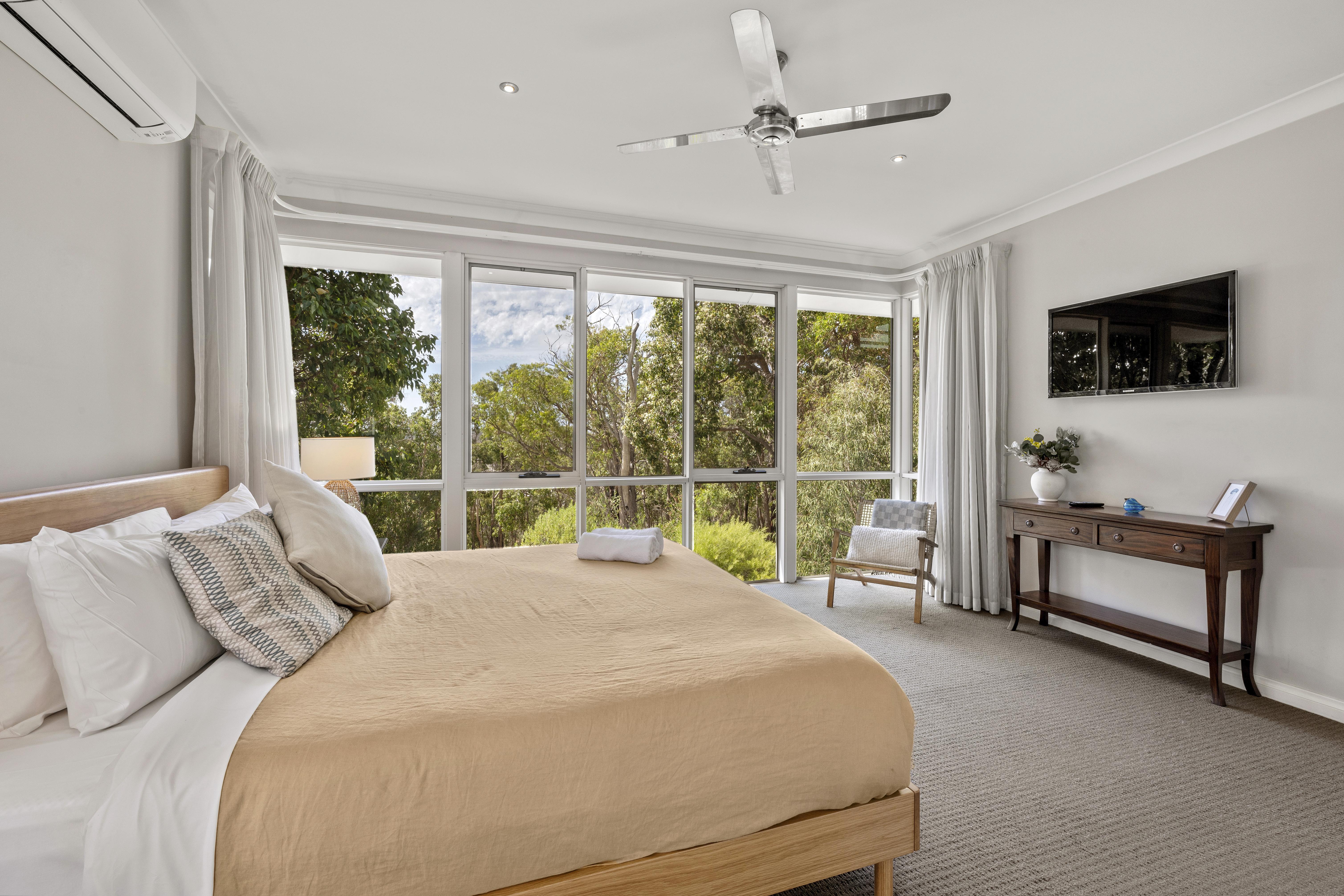 Sleeping ten people in five bedrooms, the main bedroom with King Bed, spacious en-suite with his and hers basins, shower and separate bath, reverse cycle air-conditioning, flat screen Television and views out to the surrounding bush land.