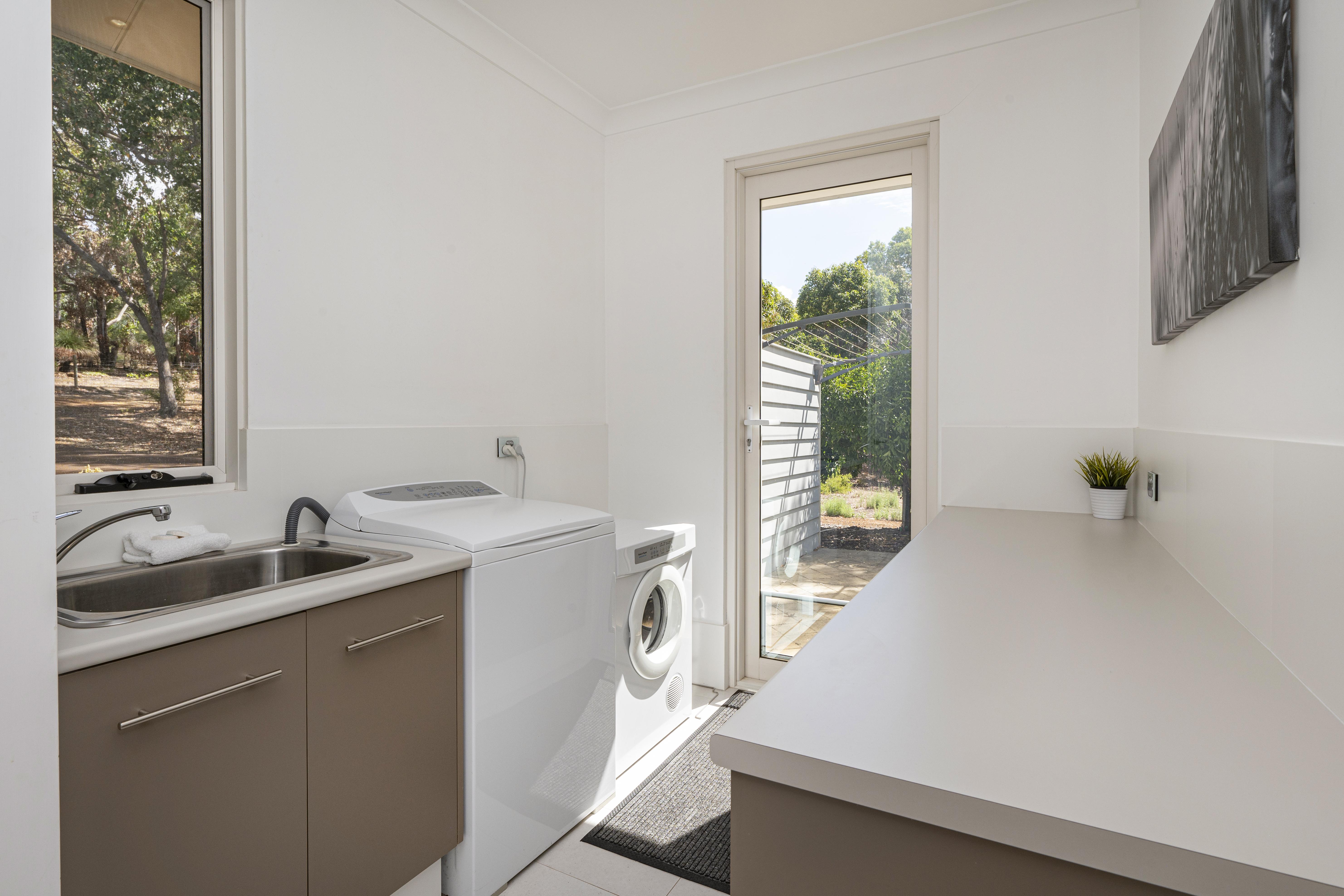 The spacious laundry has a washing machine, dryer, and a door leading out to the court yard where there is a clothes linen and & a hot/cold outdoor shower, there also a hot/cold shower just to the right of the main entrance.
