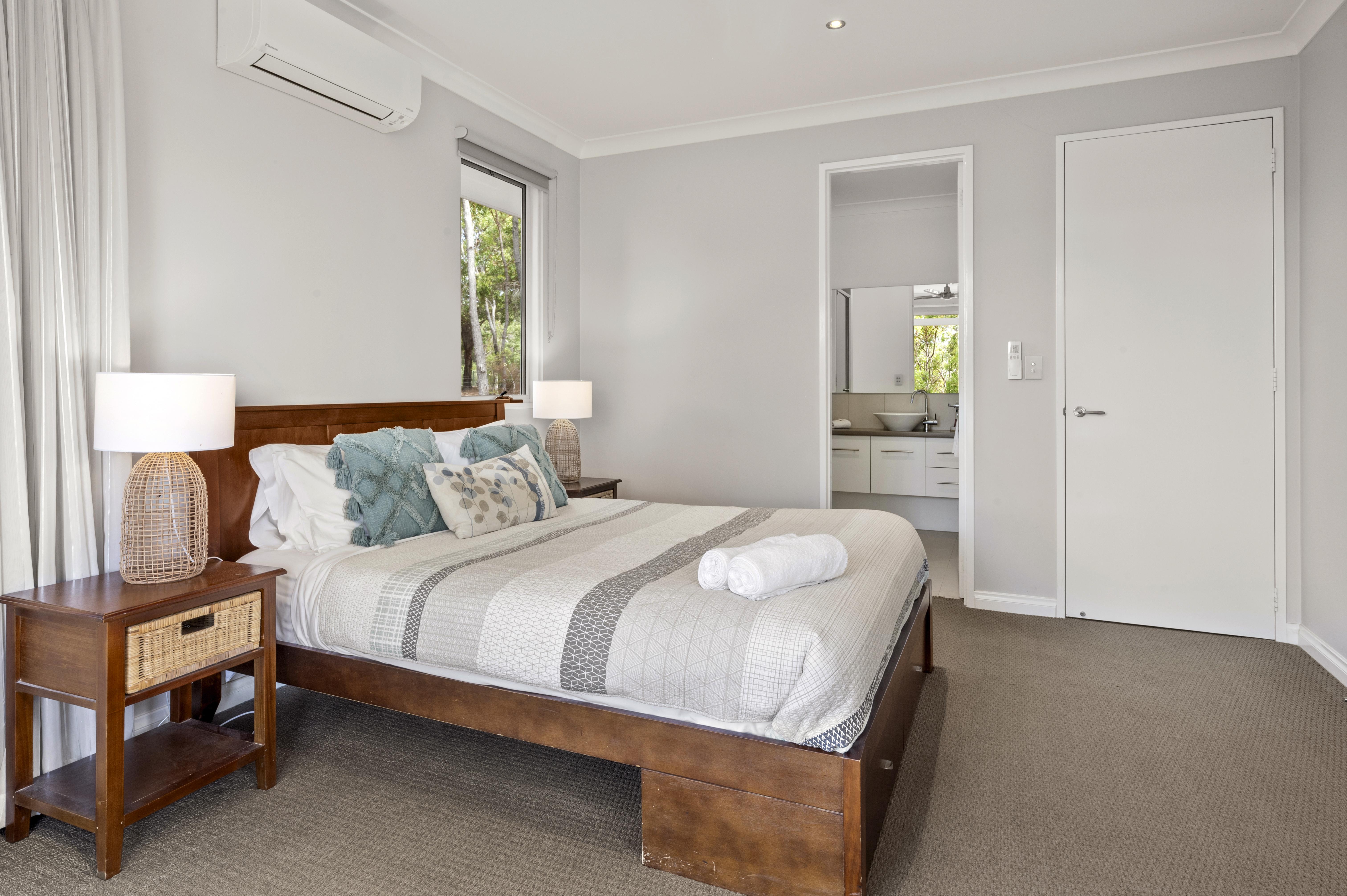 The Second bedroom (guest suite) has a queen bed, reverse cycle air-conditioning, ensuite with vanity, shower and toilet balcony entrance and amazing bush views.