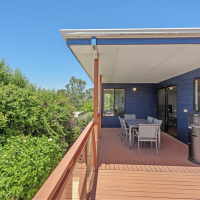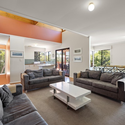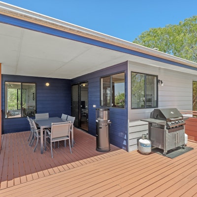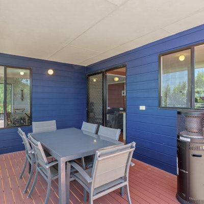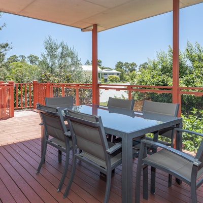 The open plan living zone incorporates spacious lounge, dining & kitchen zones with timber floors throughout. The lounge features a six seater lounge plus there are cosy bean bags if extra seating is required; flat screen television; dvd player & reverse cycle air conditioner for year round comfort. The dining suite will comfortably seat 8 guests plus there's a highchair for any littlies. The kitchen has ample work space for creating a feast & merges seamlessly with the decked alfresco area.